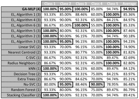 - Karzynski, M.; Mateos, A.; Herrero, J.; Dopazo, J. Using a Genetic Algorithm and a Perceptron for Feature Selection and Supervised Class Learning in DNA Microarray Data. Artif. Intell. Rev. 2003, 20, 39–51. [Google Scholar] [CrossRef]