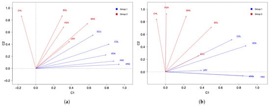 In relation to the number of COVID-19 infected cases, adding a third component, we gain and in explained variability with standard and disjoint components, respectively. Regarding the number of deaths, when going from two to three components, we gain and in variability with standard and disjoint components, respectively. In general, when using three principal components, there is an explained variability close to for both the number of infected and the number of deaths due to COVID-19. Figure 3a,b represent Table 1 and Table 4 graphically, respectively. Countries colored in blue, red, and green are grouped by components C1, C2 and C3, respectively; see Table 3 and Table 6. When comparing Figure 3a,b with the results obtained using two components, it is hard to detect similarities and differences in the ten South American countries. However, when using three components, we consider that a better classification is obtained.