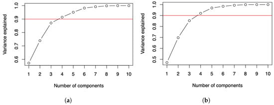 For both data matrices reported in Table 1 and Table 4, the plots displayed in Figure 2a,b for the number of COVID-19 infected cases and deaths suggest two components if it is expected to explain about of the variance, and three components if it is expected to explain about of the variance. For more details about this criterion, see []. Some alternative criteria can be seen in [,].