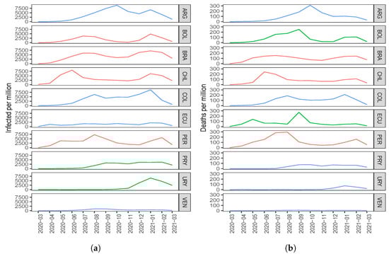 Table 9 and Table 10 allow us to conclude that, from March to June 2020 (also March 2021), CHI is the country with the most infections, followed by PER and BRA. In addition, from July to November 2020, ARG is the country with most infections, followed by COL, BRA, and PER. From December 2020 to February 2021, BRA is the country with the most infections, followed by COL, ARG, and URY.