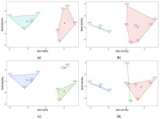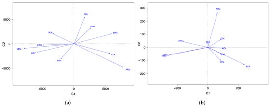 Table 7 and Figure 6a show the behavior of the countries over the course of the pandemic. Note that ECU, URY, and VEN have similar behavior, which is in contrast to BRA. In addition, the behavior of ARG and CHI differs from the rest. However, ARG and BOL demonstrate the opposite behavior from each other in the evolution of the number of new COVID-19 cases reported. We must consider that the number of new cases depends on the number of PCR tests applied, which might explain why some countries have a low rate of new cases. The position to the left of the origin in Figure 6a can be due to two situations, either: (i) the health policies are managed correctly; or (ii) insufficient detection PCR tests are carried out. A country in the first situation is URY, which is an example of correct management at the beginning of the pandemic that then ceased to be so.