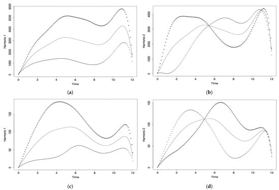 Unlike the PCA and DPCA, the FPCA considers data as functions, often over time [,,]. The FPCA allows us to capture the variability of the phenomenon under investigation through its evolution over time. In the FPCA, each eigenvalue corresponds to an eigenfunction. The eigenfunctions describe the variability in the data set []. In the FPCA, the components are called harmonics.