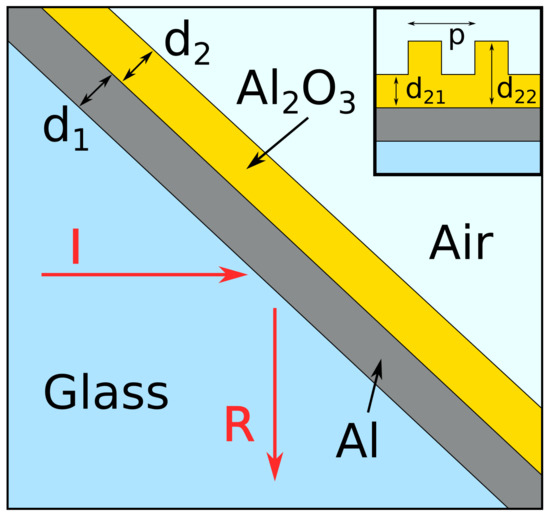 Finally, one can modify the geometry of the oxide layer to improve the sensing performance. In particular, let us consider the model of a porous Al2O3 layer, which could resemble the realistic experimental situation. In particular, the form of a grating with period nm and two thickness values of nm and nm was used (Figure 1 inset). Such a structure supports the creation of plasmons with a wavelength that is a multiple of the period [19]. Here, the value of p was set so that SPPs could be excited with the source characterized by nm.