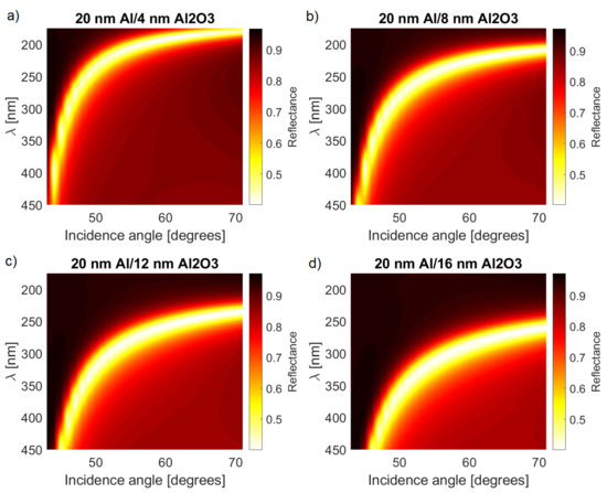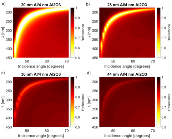 Comparison of the reflection spectra calculated for a range of wavelengths and incident angles and four different thicknesses of the oxidation layer: (a) 4 nm, (b) 8 nm, (c) 12 nm, and (d) 16 nm.
