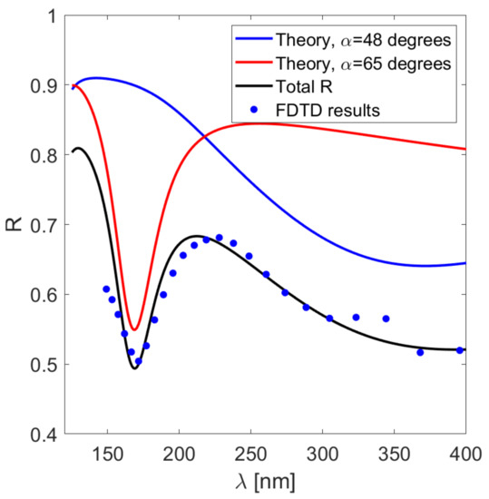 In such a case, the resulting reflection spectrum is determined by the overall structure of the reflectivity function as shown in Figure 3a. As mentioned before, there are two characteristic areas in which the spectrum is independent of and , located in the visible and UV parts of the spectrum. This can be seen in Figure 5 where the FDTD simulation results are presented. There are two pronounced peaks corresponding to the visible light SPPs excited at degrees and UV SPPs at degrees. The product of these two reflectivities closely matches the FDTD results. Thus, one can obtain significant, easily measurable reflectivity dips even when the incident angle is not precisely specified.