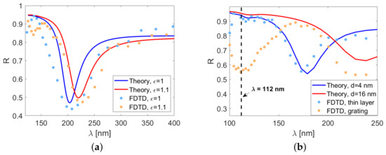 Next, the sensitivity of the plasmonic sensor to the changes of permittivity was tested. The simulation results are shown in Figure 6a. The incidence angle was set to degrees. Again, there was a fairly good match between the theoretical predictions and FDTD results. A change of ( change of ) resulted in a 20 nm shift of the reflection minimum, which is comparable to the results presented in [8].
