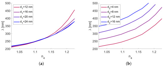 Overall, the shift toward larger angles for a given wavelength can be intuitively interpreted; the increased permittivity serves as an effective extension of the oxide layer with . Similarly, in Figure 4b, there is a significant dependence of the resonant wavelength on . In this particular example, the sensor was the most sensitive for ; the value can be fine tuned by changing the angle or , for example to adapt the design to aqueous solutions.