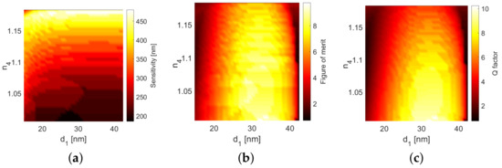 One can see that the changes of the position of the minimum are very similar regardless of , with the exception of a very small metal thickness and large (Figure 7a). The change of the oxide layer thickness resulted in a considerable shift of the minimum but had only a minimal influence on how the system responded to the changes of . The rate of change of the wavelength of the reflectance dip in response to the changes of was the sensitivity [21]. To accurately resolve the location of the dip, the full-width half-maximum (FWHM) of the minimum should be small. Thus, one can introduce another important performance parameter—the figure of merit . Finally, one can calculate the Q factor . These parameters, calculated for an incidence angle of 60 degrees, are shown in Figure 8.