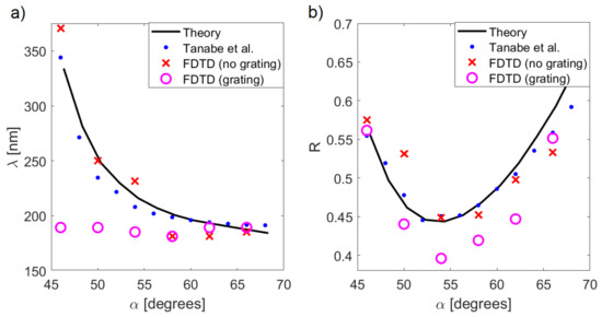 To further study the effect of the grating, the location of the reflectivity minimum and the smallest value of R were obtained for a range of angles . The results are shown in Figure 9. There was excellent agreement between the theoretical predictions given by Equation (8) and the experimental data [11]; the minimum shifts were from nm at degrees to nm at degrees (Figure 9a). The largest drop of reflectivity occurred at an intermediate angle of 54 degrees, where (Figure 9b).