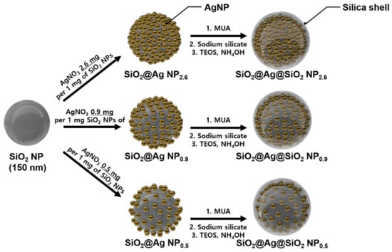 SiO2 NPs were synthesized using a modified Stöber method []. A solution containing TEOS (1.6 mL), NH4OH (3 mL), and absolute EtOH (40 mL) was stirred for 20 h at 25 °C. The solution was washed several times with absolute EtOH by centrifugation at 8885 rcf for 10 min repeatedly. To introduce thiol groups, SiO2 NPs (200 mg) were mixed with absolute EtOH (4 mL), MPTS (200 μL), and NH4OH (40 μL) for 12 h at 25 °C. The solution was washed several times with absolute EtOH by centrifugation at 8885 rcf for 10 min. Following thiol-functionalization, AgNPs were introduced onto the surface of SiO2 NPs by using a modified polyol process. In this process, each SiO2@Ag NP was introduced by using different amounts of AgNO3: 2.6 mg AgNO3 per 1 mg SiO2 NPs, 0.9 mg AgNO3 per 1 mg SiO2 NPs, and 0.5 mg AgNO3 per 1 mg SiO2 NPs with PVP (MW 40,000) in 50 mL EG. Then, 41.4 μL OA was added sequentially to each solution, and the solutions were stirred for 1 h at 25 °C. Each solution was washed several times with absolute EtOH by centrifugation at 8885 rcf for 10 min. Silica shells were introduced to each SiO2@Ag NP via the modified silica coating method []. Each SiO2@Ag NP (1 mg) was dispersed in 1 mL absolute EtOH with 0.15 mM 11-MUA and stirred for 1 h at 25 °C. Then, each SiO2@Ag NP was dispersed in 15 mL aqueous sodium silicate solution (0.036 wt%) and stirred for 15 h at 25 °C. Subsequently, 60 mL absolute EtOH was added to each solution and stirred for 3 h at 25 °C to form a thin silica shell. After 3 h, 30 μL TEOS and aqueous ammonium hydroxide (28–30%, 250 μL) were added to each solution and stirred for 24 h at 25 °C. The resulting SiO2@Ag@SiO2 NP2.6, SiO2@Ag@SiO2 NP0.9, and SiO2@Ag@SiO2 NP0.5 were washed several times with absolute EtOH by centrifugation at 8885 rcf for 10 min.