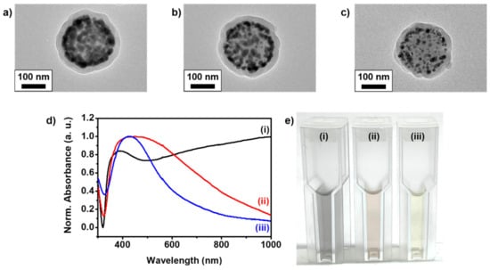 Transmission electron microscopy (TEM) images of (a) SiO2@Ag@SiO2 NP2.6, (b) SiO2@Ag@SiO2 NP0.9, and (c) SiO2@Ag@SiO2 NP0.5. (d) UV–Vis absorption spectra and (e) actual color image of (i) SiO2@Ag@SiO2 NP2.6, (ii) SiO2@Ag@SiO2 NP0.9, and (iii) SiO2@Ag@SiO2 NP0.5 in EtOH.