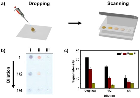 (a) Spotting of SiO2@Ag@SiO2 NPs onto the membrane and data analysis. (b) Scanned color image of the spots formed on the nitrocellulose (NC) membrane with 0.5 μL of suspensions at different concentrations (1/2 dilutions) and (c) intensity of corresponding colored spots on the NC membrane of (i) SiO2@Ag@SiO2 NP2.6, (ii) SiO2@Ag@SiO2 NP0.9, and (iii) SiO2@Ag@SiO2 NP0.5. Error bars represent the standard deviation of the mean over the three batches of measurements of analytes.