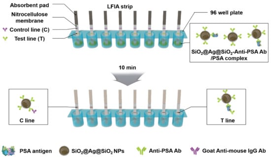 To detect PSA in LFIA via the dipstick method, as schematically illustrated in Figure 4, we used a test strip consisting of an NC membrane and an absorbent pad on the backing card. In the NC membrane, anti-PSA Ab (primary Ab; 14,801) was dispensed onto the test line, and goat anti-rabbit IgG (secondary Ab) was dispensed onto the control line. For application of SiO2@Ag@SiO2 NPs, the surfaces of all SiO2@Ag@SiO2 NPs were conjugated with anti-PSA Ab (detection Ab; 14,803) using the well-known EDC/sulfo-NHS coupling reaction []. Here, the surfaces of all SiO2@Ag@SiO2 NPs were first conjugated with NH2-PEG600-COOH to prevent aggregation and then with anti-PSA Ab (14,803). To develop the NPs of corresponding concentration, each SiO2@Ag@SiO2 NP (3 μg) was mixed with the same amount of PSA in a 96-well plate. Then, the test strip was dipped into the corresponding well and developed, and the results were confirmed by a change in the intensity of the colored band of each test line in the test strip.