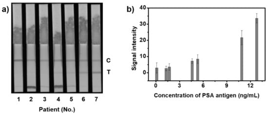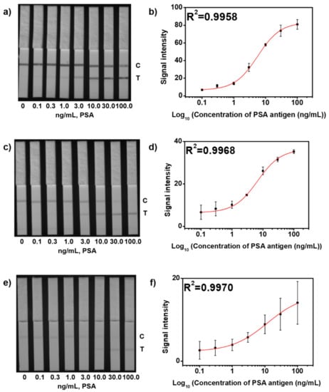 Among the various kind of cancers, prostate cancer is the second most diagnosed cancer in the world and is the sixth leading cause of cancer-related death worldwide []. Prostate-specific antigen (PSA) was known to be reproducible in blood of men without biopsy of target tissue that has increased levels in prostate cancer, is detectable in the early stages of prostate cancer and was the most reliable biomarker for monitoring prognosis [,,,]. Early diagnosis of prostate cancer by PSA detection lowers the mortality rate and plays an important role in treatment [,]. Conventional tests for prostate cancer diagnoses using PSA are mainly performed in centralized laboratories using large-scale automated analyzers, and the associated medical costs increase due to various reasons, such as sample transport, increased waiting time, and simple management. However, these detection methods often lead to over-treatment and over-diagnosis; hence, there is a need for a method that can detect PSA quickly, accurately, and economically [,]. Using LFIA for prostate cancer diagnosis, PSA can be detected at low costs and in a shorter duration, increasing patient satisfaction. Traditionally, the normal PSA level that is acceptable as the basis for biopsy in phase 3 clinical studies of early prostate cancer screening is <4.0 ng/mL [], and this serves as an important indicator for judging the presence or absence of prostate cancer via LFIA [,].