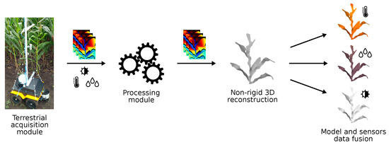 This work is inserted in this context. Not to perform phenotyping or plant growth analysis, but to provide inputs for these processes. Collecting data in the field and processing them manually is often unfeasible, since the producer would have to travel a great distance, depending on the size of the plantation, at various stages of the plant’s life [2,8,9]. Therefore, the objective of this work is to present a system for field data collection and processing to generate accurate 3D models of non-rigid corn plants in an uncontrolled environment, which, we believe, is the first system to do this; and merge this model with sensor data. Specifically, the system was composed of two modules: the acquisition module and the processing module. The acquisition module has aerial and terrestrial subsystems; both subsystems collect data from the field for post-processing; this work will present the development and characteristics of the terrestrial subsystem, called the terrestrial acquisition module from now on. This module is composed of a robot equipped with three sets of temperature, humidity, and luminosity sensors and an RGB-D (Red, Blue, Green and Depth) camera, and is responsible for navigating inside the plantation and collecting the data. In turn, the processing module is responsible for performing non-rigid 3D reconstruction of the plants generating a 3D model with precise measurements, as well as merging the sensors data into these models. The proposed system macro view can be seen in Figure 1. Besides these important contributions, the present work implements a novel technique for background removal in depth images, based on the logarithmic function. Several 3D reconstruction techniques were analyzed, and those that proved to be efficient were selected to be part of the system, such as point cloud treatment, surface reconstruction, and model deformation. The system was developed to work with corn crops, but can be adjusted in the future to meet the needs of other crops.