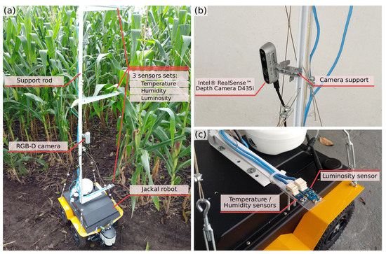 Carefully analyzing the problem of monitoring a corn plantation, some variables that are important to follow its growth were defined; as the size of the plant varies over time, these variables should be followed at different heights. Thus, a 1.5 m aluminum rod was installed in the robot, with supports for installing the sensors. The supports can be positioned at different heights, allowing more flexibility for data collection according to the life moment of the plantation. The variables chosen to monitor the plants were: temperature, humidity, and luminosity. Through these variables, it is possible to evaluate the environmental conditions in which the plantation is inserted, allowing the phenotyping process to define actions to solve problems in plant growth. Besides the sensor supports, the rod also allows the installation of an RGB-D camera, at different heights. Through the depth images, it is possible to reconstruct 3D models of the plants. Figure 2 shows the robot with the rod, the RGB-D camera installed and the sensor support in detail.