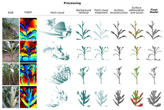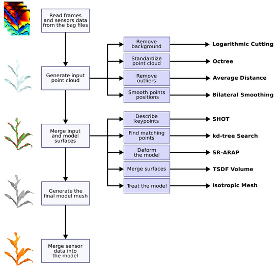 The first operation of the system is to read the bag files generated by the terrestrial acquisition module. From these files, the frames of the depth videos and the data recorded by the sensors are extracted. Then, from those depth images, the input point cloud is generated. This procedure involves the removal of the background, using a novel technique based on the logarithmic function; standardization of the point cloud, using the octree data structure; removal of outliers using the average distance between points; and smoothing the points position using the Bilateral Smoothing technique. With the point cloud presenting as few problems as possible the input surface is reconstructed using the Advancing Front technique, based on the Delaunay triangulation. The first processed frame generates the first model, which is deformed at each iteration with a new input frame. For each iteration, the model surface is deformed to align with the input surface, also accumulating data. This operation involves describing the objects keypoints with the Signature of Histograms of Orientations (SHOT) technique; matching the keypoints (kd-tree search); deforming the model, using the Smoothed Rotation Enhanced As-Rigid-As Possible (SR-ARAP) technique; merging the surfaces, by merging the volumes described by the Truncated Signed Distance Function (TSDF); and further processing the model, removing new outliers, smoothing the points, and reconstructing the surface isotropically. After processing all the frames (key frames), the system merges this model with the data collected by the sensors through colorization. The colorized 3D model is then exported as a Polygon File Format (PLY) file [69], which can be effectively used as input for the phenotyping process. Figure 3 shows the flow described in graphical form. Further details of the operations mentioned will be presented next.