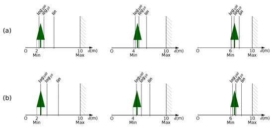 Examples of background removal for two logarithmic bases (10 and 100) of the proposed technique at different distances, compared to the linear form (lin). (a) Considering a cutoff factor of 0.4 and (b) considering a cutoff factor of 0.5.