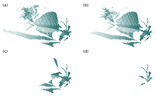 Example of background removal in a point cloud considering a cutoff factor of 0.2. (a) Input point cloud ( and ); (b) linear cutting (at ); (c) cutting by the proposed technique with base 10 (at ); (d) cutting by the proposed technique with base 100 (at ).