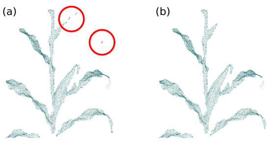 Outliers removal. (a) Input point cloud, the red circles indicate regions of outliers and (b) point cloud after the outliers removal operation ().
