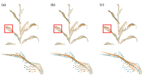 Point cloud smoothing. The orange point cloud indicates the smoothed point cloud, with (a) one iteration; (b) two iterations and (c) three iterations.