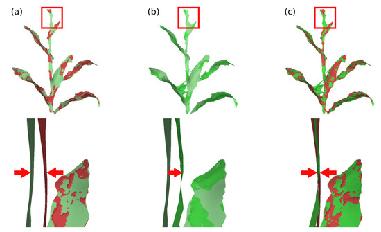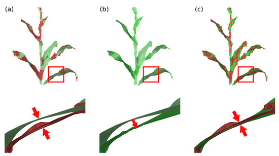 Model deformation in plant’s leaf region. (a) Difference of the plant’s leaf position between the model deformation graph (green) and the input surface deformation graph (red), during processing between frames 40 and 50; (b) deformation of the model surface and (c) comparison between deformed model surface (green) and input surface (red).