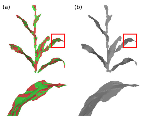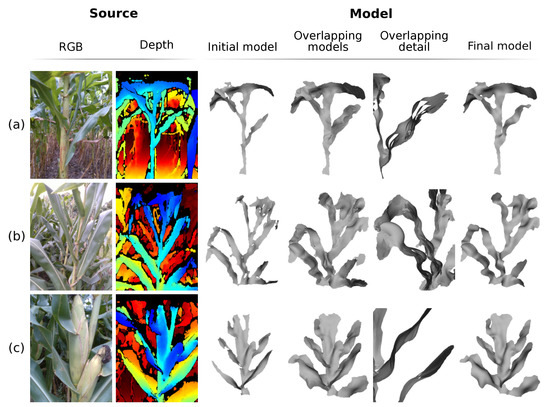 is the optimal rotation matrix from source vertex position to target position; represents the edge weight; represents the set of vertices adjacent to in ; is the scalar weighting, where A represents the surface area to make the energy invariant to global scaling; F indicates that the difference between the rotation matrices of the vertices and their neighbors is calculated by the Frobenius matrix norm; and represents the new position of the vertices after deformation. The minimization of this equation can be simplified to the minimization of the energy of each vertex , considering that there are two unknowns: the new positions of vertices that are not part of the set of control vertices; and the rotation matrices . This minimization can be performed in two steps (local/global method) and iteratively, to further improve the deformation result [77,78,79]. In the proposed system, two stopping parameters were set for the deformation algorithm; either a pre-defined maximum number of iterations or a minimum value of the energy function . The Figure 11 and Figure 12 present examples of surface deformation in two different regions of the plant, considering a sequence of depth images; in these figures it is possible to visualize how the proposed system performs the non-rigid deformations to align the surfaces for subsequent fusion.