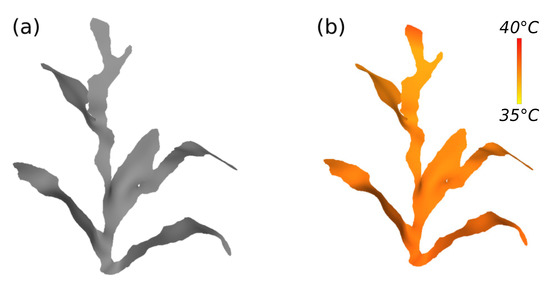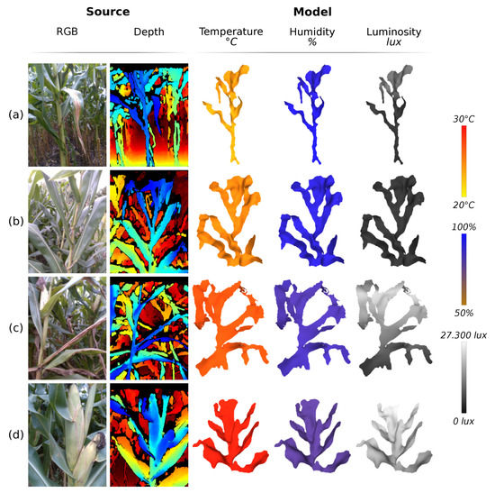 After processing all the input frames and generating the plant model, the system performs the fusion of the data collected by the sensors with the model. This fusion happens through the colorization of the model regions, according to the sensor values of the heights where they were installed; in the case of the proposed system, three heights. This way of fusion allows a quick visualization of the environmental conditions in which the plant is inserted. The system implements the data fusion in a separate way; that is, n copies of the models are created, one for each variable collected. To perform the model colorization, the linear interpolation of the RGB color space channels was implemented, relating the sensor heights; the sensor values; and parametric values of limits, of the variables and their colors. It was considered the linear interpolation Equation [83]