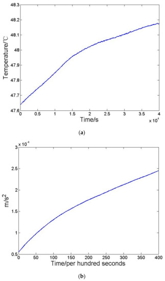 (a) The temperature variation of the accelerometer, and (b) the mean value per hundred seconds of accelerometer outputs.