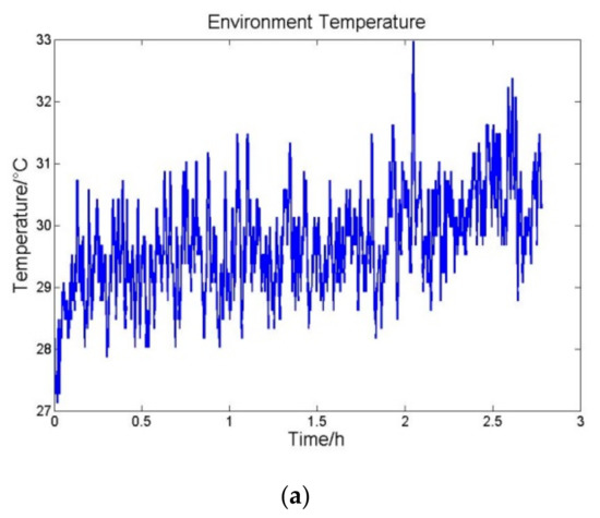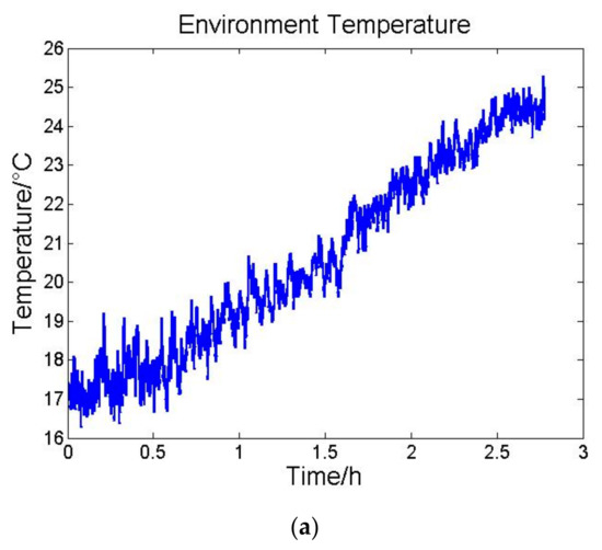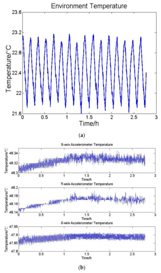 At first the INS stays still and is tested under the laboratory environment without the temperature control system. The duration of the experiment is 3 h. The environment temperature variation, accelerometers temperature variation and average output of accelerometers per hundred seconds are shown in Figure 5.