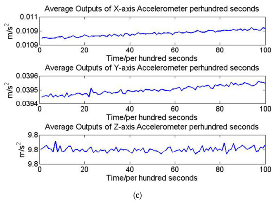 (a) Environment temperature variation, (b) accelerometers temperature variation and (c) the average outputs of accelerometers per hundred seconds.