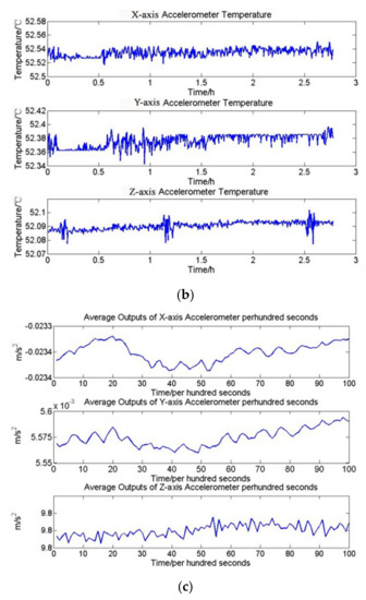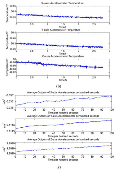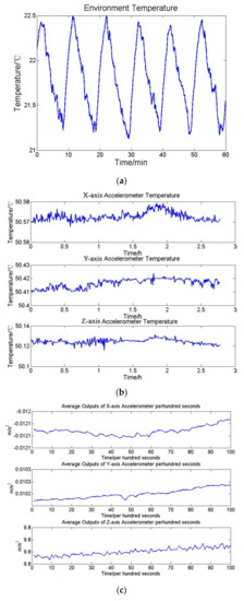 (a) Environment temperature variation (b) accelerometers temperature variation and (c) the average outputs of accelerometers per hundred seconds.