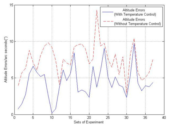 In the attitude experiment, it can be seen that attitude errors of the INS with temperature control is relatively smaller than that of INS without temperature control. Even though the attitude errors change in different experiments, results of the thermal stable system are commonly better than the system influenced by temperature variations.