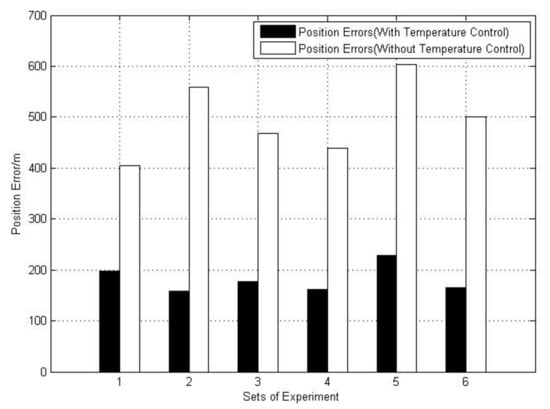 According to the experiments above, the precise temperature control system proves to be useful comparing with the INS without temperature control. The system is able to maintain the temperature variation of the accelerometer at 0.01 °C and make the output accuracy match up with requirements at 1 × 10−5 m/s2. Theoretical thermal analysis has been validated and the precise temperature control system can be effective in different temperature conditions. Additionally, attitude and position accuracy can also be improved through precise temperature control.