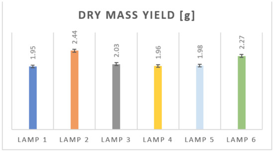 The measurement of dry mass yield of mint plants used in this study and harvested at the end of the cultivation was the second important component of the first research stage (leaf spectrum measurements). All seven plants from each cultivation stand were used. The averaged results are shown in Figure 5, for each lamp, respectively. Total measurement error was estimated to be 1.5%, based on the accuracy of humidity determination (1%) and weight measurement resolution (10 mg).