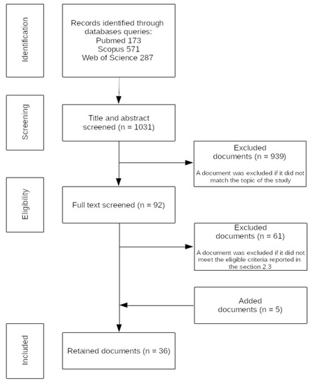 The electronic screening on merged databases yielded 1031 documents. After merging records among databases, title and abstract screening allowed us to discard 939 documents; thus, we only retained 92 documents. According to the eligibility criteria, 31 documents passed the in-depth screening. Five further documents were added after screening references. Therefore, the final number of retained papers was 36. Figure 1 summarizes the flowchart of the reviewed documents.