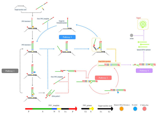 Figure 1 illustrates the 3WJ-induced transcription amplification process. The template (3WJ_template) contains the light-up RNA aptamer sequence (S, green), the recognition site for Nt.AlwI (5’-NˇNNNNGATCC-3’, N, blue), a sequence that mediates the formation of 3WJ (Y, yellow), the target-specific region (T1, black), and a promoter sequence (P, red). In addition, the primer (3WJ_primer) contains a target-specific region (T2, black) and a sequence that mediates the formation of 3WJ (Y, yellow). The presence of the target nucleic acid (T1-T2, black) induces the formation of the 3WJ structure with 3WJ_template and 3WJ_primer, leading to the strand displacement amplification reactions by Klenow DNA polymerase (exo-) and Nt.AlwI. As a result, abundant DNA probe I is produced in pathway 1. Furthermore, DNA probe I binds to 3WJ_template in pathways 2 and 3, initiating multiple rounds of strand displacement amplification reactions. Importantly, strand displacement amplification (pathways 1–3) is combined with T7 RNA polymerase-mediated transcription amplification (pathway 4). Because the final DNA product contains two ds promoter regions, T7 RNA polymerase initiates transcription amplification. As a result, several light-up RNA aptamers (Spinach aptamers) are generated, leading to a high fluorescence signal after complexation with DFHBI (pathway 4). In contrast, in the absence of the target nucleic acids, the 3WJ structure is not formed, and thus 3WJ-induced transcription amplification does not occur, emitting a negligible fluorescence signal. The proposed strategy is performed at 37 °C, and the target nucleic acids can be identified within 2 h by measuring the fluorescence signal emitted by DFHBI.