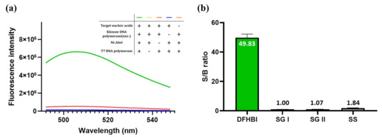 Detection feasibility of the proposed strategy. (a) Fluorescence emission spectra under different conditions. (b) The signal-to-background (S/B) ratio of the proposed strategy using different nucleic acid staining dyes such as DFHBI, SYBR Green I (SG I), SYBR Green II (SG II), and SYBR Safe (SS). All experiments were performed in triplicate.