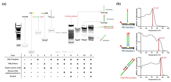 Confirmation of 3WJ-induced isothermal amplification. (a) Representative images of polyacrylamide gel electrophoresis of the reaction products obtained after strand displacement amplification. (b) Melting curve analysis for the reaction products obtained after strand displacement amplification. 3WJ structure 1: target DNA + 3WJ_template + 3WJ_primer (lane 9 in (a)); 3WJ structure 2: target DNA + 3WJ_template + 3WJ_primer + Klenow DNA polymerase (exo-) (lane 10 in (a)); final DNA product: target DNA + 3WJ_template + 3WJ_primer + Klenow DNA polymerase (exo-) + Nt.AlwI (lane 11 in (a)).