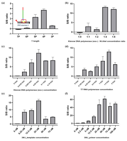 First, we optimized the complementary sequence length between 3WJ_primer and 3WJ_template. The results in Figure 4a demonstrate that the S/B ratio decreased as the complementary sequence length was increased up to 7 base pairs (bp), which was attributed to the ability of 3WJ_primer and 3WJ_template to hybridize each other even in the absence of the target nucleic acids, thus increasing the background signal. On the contrary, when the sequence length was short (3 bp), the 3WJ structure was not effectively formed even in the presence of the target nucleic acids, leading to a low S/B ratio. Based on these optimization results, the complementary sequence length between 3WJ_primer and 3WJ_template was selected as 4 bp.
