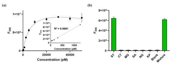 Detection performance of the new detection system. (a) Detection sensitivity of the new detection system. Inset shows the linear range between fluorescence intensity at 506 nm (F506) and target nucleic acid concentration (0–1250 pM). (b) Detection selectivity of the new detection system. The target nucleic acid is from Salmonella Typhi (ST), whereas the non-target nucleic acids are from Chlamydia trachomatis (CT), Mycoplasma genitalium (MG), Staphylococcus aureus (SA), Neisseria gonorrhoeae (NG), and Klebsiella pneumonia (KP). The final concentration of both target and non-target nucleic acids is 10 nM. All experiments were performed in triplicate.