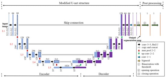 The last feature map group of L5 (denoted by the purple rectangular) consists of 1025 32 × 32 feature maps. In a classical CNN for classification, there is usually a set of fully connected layers and softmax layer to produce a vector of class scores after this feature map group. With the scores, the classification can be predicted at the image level (global level). However, in semantic segmentation tasks, the goal is actually to achieve the pixel-level classification. FCN and its modified versions or U-net apply a series of upsampling and feature fusion operations to increase the resolutions of feature maps and obtain the final semantic segmentation map. In this study, a set of deconvolution operations with 512 2 × 2 kernels for the purpose of upsampling follows the last feature map group of L5 (1024 32 × 32). It produces a feature map group with a number of 512 and a resolution of 64 × 64. By a feature fusion operation, which copies the last feature map group in L4 of the encoder and concats with the newly upsampled feature map group via a skip connection, a new feature map group with a number of 1024 and a resolution of 64 × 64 is produced. It should be noted that instead of “concat”, element-wise adding is used in the original FCN to conduct feature fusion. After two “conv 3 × 3, ReLU” operations with 512 3 × 3 kernels, two feature map groups with a number of 512 and a resolution of 64 × 64 are obtained in L4 of the decoder. The same procedure performed from L5 to L4 of the decoder is repeated through L4 to L1 of the decoder. During the procedure, the number of the feature map in each group decreases but the resolution of the feature map increases. Finally, two feature map groups with the number of 64 and the resolution of 512 × 512 are obtained, which is the same as with the input image. The last feature map group follows a set of convolution operations with 64 1 × 1 kernels to produce a feature map with the size of 512 × 512. Then, after going through the sigmoid function and image binarization using the threshold, the output segmentation map is obtained.