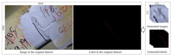 The original dataset was granted by the organizing committee of the 1st International Project Competition for Structural Health Monitoring (IPC-SHM 2020) [,]. It includes 120 image–label pairs for training and testing purposes and additional 80 original images without the labeled part. Eighty of the 120 image-label pairs are selected as the training dataset, and the remaining 40 are selected as the test dataset. The resolutions of the original images are 4928 × 3264 pixels and 5152 × 3864 pixels, which are too large for direct training and testing. Training or testing directly using images with such large sizes would induce an out-of-memory error, even if a high-performance graphics processing unit (GPU) is equipped. Actually, in most of the deep-learning-based crack semantic segmentation applications in the literature, the size of the input image is much smaller than the examples in this study. For the sake of higher training and testing efficiency, in this study, it is necessary to preprocess the original 120 image–label pairs and generate a different appropriate dataset with a suitable resolution for training and test purposes. The resolution of the images in the new datasets would fit the size of the input image shown in Figure 1. The images in the original dataset are cropped into small image patches (generated images and generated labels) with the resolution of 512 × 512 as illustrated in Figure 2. As stated in [], the original image dataset was obtained by the bridge inspectors with different camera and lens configurations. Then, the fatigue cracks were visually detected, and the fatigue crack regions were manually labeled in the images at pixel level. As shown in Figure 2, not only are the fatigue cracks shown in the images, but also the markers and annotations are presented to indicate the fatigue crack information. Since the fatigue cracks are very thin, sometimes it is hard to find them in Figure 2. Detailed image and label samples used in this study are found in [].