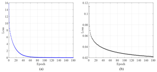 To verify the developed method using U-net, in this study, FCN [] was also implemented as the semantic segmentation model, and the Resnet34 [] was selected as the backbone of FCN. Details of FCN can be found in []. The FCN was trained with the same dataset as presented in Section 4. Figure 3 shows the loss curves of U-net and FCN during the training process over epochs. From Figure 3a, it can be seen that in the first 20 epochs, the training loss drops dramatically, and after Epoch 20 (loss is 2.47), the loss decreases slowly. The loss at Epoch 90 is 0.076, which is already quite small. From Epoch 90, the loss of U-net gradually reduces to zero, and increasing the training epochs might give a trend of model overfitting. However, for the loss of FCN as shown in Figure 3b, after Epoch 90, the loss still gradually decreases, but the change is slow. For comparison purposes, the loss curves of the training of the two different models only keep 180 epochs.
