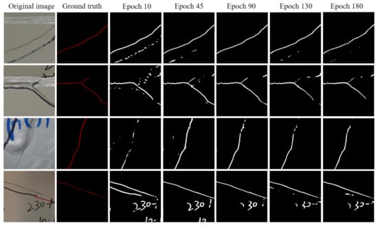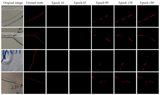 For FCN, as shown in Table 1, before Epoch 90, the mean values of precision, recall, F1 score, and IOU increase very fast as the training epoch increases. After Epoch 90, the increase becomes slow. Figure 5 lists the FCN prediction examples on the generated test dataset using the weights at different epochs. By comparing with the prediction results using the model weights obtained at different epochs and the ground truth, it can be seen that the prediction results at Epoch 180 give the best in the first 180 epochs during the training of FCN. This is consistent with what is observed from the evaluation indicators as listed in Table 1. It should be noted that before Epoch 45, FCN can barely output fatigue crack prediction results, and in Figure 5, the result columns of Epoch 10 and Epoch 45 only show a black background. The result columns of Epochs 90, 135, and 180 show clearly identified fatigue crack fragments. Combining Figure 3b, Figure 5 and Table 1, the weight parameters of the trained FCN model obtained at Epoch 180 can be used as the final prediction tasks.