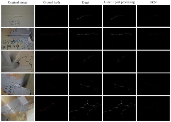 For FCN, as shown in the last column of Figure 6, it apparently provides a large amount of disconnected fragments of fatigue cracks in the listed example images. Compared to U-net and U-net with post-processing, FCN could not output better segmentation results with an acceptable accuracy at the current training stage. The comparative results indicate that the proposed method using U-net can achieve better segmentation performance with fewer training epochs. Moreover, the U-net structure implemented in this study is much simpler than FCN with ResNet 34 as the backbone, which is another advantage of U-net.