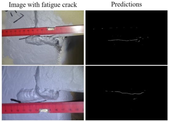 (4) The marker curves, edges of weld lines, and handwritings might be detected as small fatigue crack fragments by using the proposed method, and it is difficult to fully eliminate them with more training epochs or post-processing.