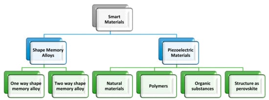 Numerous research efforts have focused on the direction of applications of smart materials in engineering structures. These smart materials possess some attributes, which can be altered desirably under a controlled environment through temperature, stress, and an electric or a magnetic field, which act as external stimuli []. The most typical examples of smart materials widely employed in different areas are shape memory alloys and piezoelectric materials, as shown in Figure 1. The latter of the two is characterized by a unique feature referred to as the electromechanical effect. This characteristic is due to the interaction between a given material’s electrical and mechanical properties []. For energy harvesting, piezoelectric materials are developing as breakthrough energy harvesters due to their outstanding ability to create electricity from underutilized vibrations of electronics. Today, there is a large choice of piezoelectric materials to select from as a result of the research done on these materials (Figure 1).