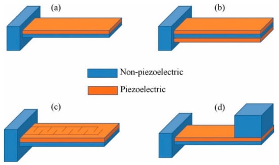 Cantilever beam transducer (a) unimorph; (b) bimorph; (c) cantilever with interdigitated electrodes; (d) cantilever with proof mass at its free end. Reprinted from [], Copyright 2021, with the permission of AIP Publishing.