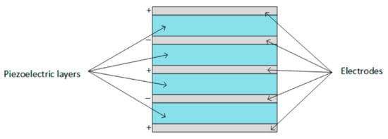 Figure 4 shows the circular diaphragm structure, which consists of a thin disk-shaped piezoelectric layer attached to a metal shim fixed on the edges of the clamping ring. A proof mass is attached at the core of the diaphragm to improve the power output and the performance under low-frequency operation []. Figure 5 shows cymbal transducers used in applications that have high impact forces. It typically consists of a piezoelectric ceramic disc and a metal (steel) end cap on each side. Steel has higher yield strength than brass and aluminum, achieving high load capability in the transducer [,]. Multiple piezoelectric layers are stacked over each other to form stack piezoelectric transducers. Layers are stacked such that the poling direction of the layers aligns with the applied force (Figure 6). These transducers are used in applications which demand higher pressure [].